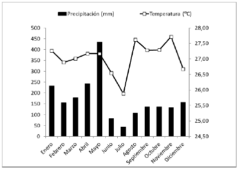Toma de muestras: Los muestreos de la macrofauna del suelo fueron realizados durante los meses de mayo y octubre de 2017, y de acuerdo con el IDEAM 2017 11 se registró una precipitación mensual de 435 mm con una temperatura promedio de 27,17°C en mayo y una precipitación mensual de 137 mm con una temperatura promedio de 27,29°C en octubre (Figura 2).
