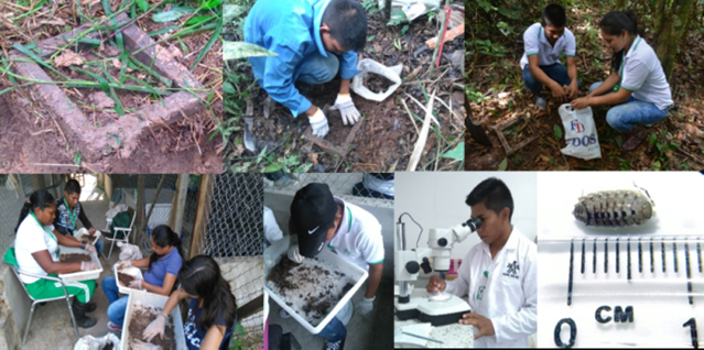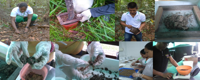 FIGURA 3 Secuencia del muestreo de la macrofauna del suelo, separación e identificación en campo (mayo y octubre, 2017) y proceso de identificación en el laboratorio (noviembre, 2017).