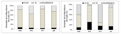 El segundo horizonte del suelo (10-20 cm) presentó una densidad muy baja de invertebrados en todas las áreas y en los dos periodos de muestreo, lo que puede indicar que por debajo de los 10 cm de profundidad hay una menor contribución de la actividad de la macrofauna del suelo en este horizonte.