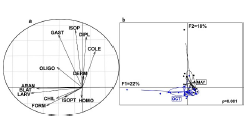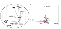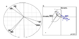 También, se realizó un análisis estadístico multivariado de componentes principales (ACP) con la prueba de Montecarlo 17, conforme metodología indicada en varios estudios de investigación 9,19,20,21,22. Estos análisis son realizados con el propósito de identificar los factores predominantes para las variables de las comunidades de la macrofauna del suelo (densidad ind/m2) y de la morfología del suelo (tipos de atributos) en los fragmentos forestales y en el área de pastizal. Un análisis estadístico de coinercia fue realizado para determinar correlaciones entre los vectores del análisis de componentes principales (ACP) para las variables de la macrofauna del suelo y de la morfología del suelo en las áreas estudiadas en ambos periodos de muestreo. Los análisis estadísticos multivariados fueron realizados en el software R 23 y el ACP en el paquete ADE4 24.