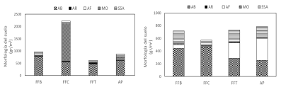 Las lombrices de tierra (Oligochaeta) y los grupos de insectos sociales, hormigas (Formicidade) y termitas (Isoptera), fueron los más predominantes en el FFC y FFT (Tabla 2). Estos tres grupos de la macrofauna del suelo son clasificados como "ingenieros del ecosistema" 8 porque producen estructuras biológicas originadas de sus actividades, que promueven alteraciones en los atributos micromorfológicos y físicos del suelo, como la infiltración de agua y la aireación del suelo por el aumento de la porosidad. Sin embargo, estos grupos son muy sensibles a las variaciones del uso de la tierra y de la cobertura del suelo y, por lo tanto, pueden ser estudiados como indicadores de recuperación del suelo de bosques forestales 19,31.