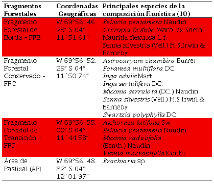 La vegetación predominante en los fragmentos forestales fue típica de bosque secundario en estado de regeneración, con enriquecimiento de especies arbóreas nativas de la región y el área alterada de pastizal fue cubierta por pasto de Brachiaria sp. 10 (Tabla 1).
