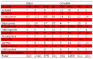 Macrofauna del suelo: Fueron encontrados un total de 5332 individuos de la macrofauna del suelo distribuidos en un total de 14 grupos taxonómicos, siendo que en mayo (2329 individuos, distribuidos en 12 órdenes taxonómicas), y en octubre (3003 individuos, distribuidos en 14 órdenes taxonómicas) (Tabla 2).