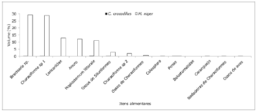Figura 3 Percentual de volume dos itens alimentares consumidos por C. crocodilus e M. niger na Resex Lago do Cuniã, coletados em novembro de 2016.