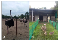Figura 1 Avestruces del criadero en el municipio de Puerto Tejada. A. Avestruces en corral de 1 año. B. Polluelos de avestruz de un mes de edad.