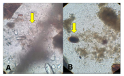 Figura 2 Quistes y huevos parasitarios observados en heces de los avestruces. A. Quiste de Balantidium sp. B. Sugestivos de huevo de Libyostrongylus sp.