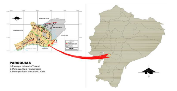 Sitio de estudio. El análisis de la calidad del huevo marrón comercial se realizó en tres parroquias del cantón La Troncal de la Provincia de Cañar, Ecuador, ubicado entre 2°28'22" y 2°30'05" latitud sur, y entre 79°14'14" y 79°31'45" longitud oeste. La jurisdicción cantonal abarca alrededor de 32,780 hectáreas subdivididas en: Parroquia La Troncal 12,483.4 ha, Parroquia Manuel de J. Calle 3,746.8 ha y Parroquia Pancho Negro 16,549.8 ha (Figura 1). La altitud oscila entre 24 y 200 m, con temperaturas promedio 24.6°C., mínima 20.9°C y máxima 29.2°C 5.