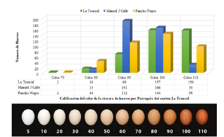 Los huevos color 90, 100 y 110, se colectaron en La Troncal (96%), seguida de Manuel J. Calle (97%) y Pancho Negro (89%). Los huevos provenientes de la parroquia Manuel J. Calle fueron color marrón más oscuro (100 y 110): 78% y los de La Troncal y Pancho Negro fueron color marrón menos oscuro (90 y 100): 89% y 64%, respectivamente.