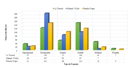 En la Figura 3 se observa la clasificación de los huevos por peso, según la Norma Técnica Ecuatoriana NTE INEN 1973:2013. Se encontraron huevos de cinco o seis categorías de peso en las tres parroquias. Respecto a los 1,200 huevos, la categoría más frecuente fue extragrande (38%), seguida de grande (30%), gigante (19%), supergigante (6%) y mediano (6%), la categoría de huevo pequeño fue muy baja (1%). Es decir 87% de los huevos fueron de categorías extragrande, gigante y grande.