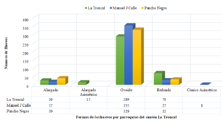 La Figura 4 muestra que, de los 1,200 huevos, 81% fueron ovoides y 11% redondos (92% de estas dos formas). Respecto a los 400 huevos de cada parroquia, de La Troncal, Manuel J. Calle y Pancho Negro se colectaron 72%, 89% y 82% de huevos ovoides, respectivamente. Es decir, las tres parroquias producen principalmente huevos ovoides.