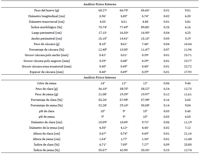 Análisis físico externo: Peso de huevo (g), diámetro longitudinal (cm), diámetro transversal (cm), índice morfológico, (%), largo perimetral (cm), ancho perimetral (cm), peso de cáscara (g), porcentaje de cáscara (%), grosor de cáscara polo ancho (mm), grosor de cáscara polo angosto (mm), grosor de cáscara zona ecuatorial (mm) y espesor de cáscara (mm).