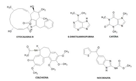 Métodos químicos de inducción a poliploidía. Requiere de moléculas cuya acción interfiere con alguno de los pasos realizados en la división celular. En estos métodos, se han utilizado diferentes moléculas (Figura 2), como Citocalasina B, 6-Dimetilaminopurina, Cafeína, Nocodazol y Colchicina 6,8,20,21,23,25,29,31,38,39.