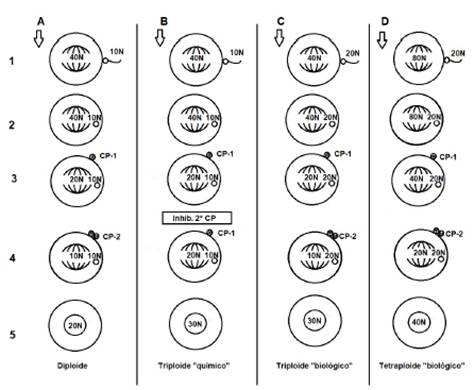 Stanley et al 29, reportaron por primera vez el uso de Citocalasina B, como inductor, aplicándolo durante la meiosis 1 (M1) y dando como resultado embriones poliploides en la ostra Crassostrea virginica (Figura 3). Posteriormente, se obtuvieron resultados en otras especies, como Mytilus edulis y Haliotis discus. Curiosamente, en esta última, la Citocalasina B, no inducía triploidías, sino tetraploidías 25.
