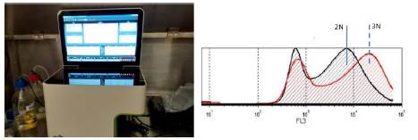 Otra metodología, la citometría de flujo, se fundamenta en el análisis de las características ópticas y emisión de fluorescencia de las muestras procesadas 3,26,30,31,36,37 (Figura 4). Para el análisis de ploidías, se tiñen células libres con Ioduro de propidio (PI) u otra sustancia análoga, que se adhiere al ADN. Posteriormente las muestras son irradiadas con láser y analizadas durante su paso por capilares, donde sus espectros son captados y procesados por el equipo. A mayor cantidad de PI por partícula analizada, mayor fluorescencia y mayor contenido de ADN, permitiendo determinar los diferentes grados de ploidía en las muestras, las cuales son mostradas como curvas cuyos picos indican las proporciones relativas de ADN 54.