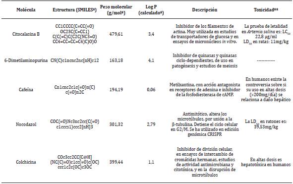 En el Tabla 1 se resumen características fisicoquímicas de algunas sustancias utilizadas en inducción poliploide, incluyendo como parámetro el logaritmo del coeficiente de reparto octanol/agua (Log P), que permite identificar la afinidad lipídica, y capacidad de atravesar membranas biológicas 45.