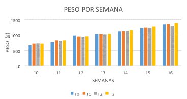Los resultados del ADEVA (Tabla 3) para la variable peso corporal semanal de las ponedoras, presentó diferencia significativa en los tratamientos al (p>0.05) en la semana 10 resultando con un mayor promedio de peso el T2 con un valor de 716,25g. En la semana 11 hubo diferencia significativa al (p>0.05) entre los tratamientos aplicados resultando con un mejor promedio en peso el T3 con un valor de 818 g. En la semana 11 y 13 estadísticamente los tratamientos resultaron no significativos resultando con mayor peso el T0 con un valor de 972,15g; y con un valor de 1028,75g en ambos casos sin la presencia de ácidos orgánicos. En la semana 14 y 15 existió diferencia significativa al (p>0.05) entre los tratamientos resultando con mejor promedio el T3 en ambas semanas con un valor de 1156,50g y 1275,25g respectivamente. Por último, en la semana 16 no existió diferencia significativa al (p>0.05) entre los tratamientos resultando con un mejor promedio el T3 con un valor de 1385,50g.