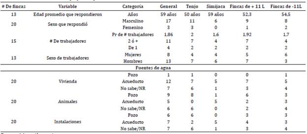 Se encuestaron 20 pequeños productores del sector lechero, siendo 14 del municipio de Tenjo y 6 del municipio de Simijaca. El promedio de edad de los productores de Tenjo es de 50 años y de Simijaca es de 59 años, predominando el género masculino. El número de trabajadores fue de 2 en Tenjo y 1,6 en Simijaca. La fuente de agua para las viviendas es de acueducto en ambos municipios, para consumo de animales y lavado de instalaciones es utilizada agua de pozo profundo en el municipio de Tenjo, mientras que en Simijaca es de acueducto (Tabla 1.). Las fincas que producen ≥11 L de leche por vaca diario en su mayoría tienen dos o más trabajadores, con una edad promedio de 52,3 años; las fuentes de agua que utilizan para vivienda y lavado de instalaciones son de acueducto y para animales es de pozo profundo. Mientras que en las fincas que producen <11 L de leche la edad promedio es de 54,5 años, la fuente de agua para vivienda es de acueducto, mientras que para animales y lavado de instalaciones es de pozo profundo y acueducto (Tabla 1.).