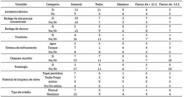 En Tenjo 11/14 fincas poseen asistencia técnica, 9 ordeñan de manera mecánica, 6 utilizan papel periódico para la limpieza de las ubres, 7 realizan chequeo de mastitis, 3 cuentan con tractor y realizan chequeo de podología, 7 tienen bodega de almacenaje de concentrado y 5 bodega de abono. Mientras que de las 6 fincas de Simijaca ninguna finca posee asistencia técnica, 4 ordeñan de manera mecánica, utilizan toalla-trapo para limpieza de ubres, 3 cuentan con bodega de almacenaje de concentrado, ninguna cuenta con bodega de abonos, ni realizan chequeos de mastitis, ni de podología y 6 utilizan tanque como sistema de enfriamiento debido a ser pertenecientes a una asociación lechera (Tabla 2.).