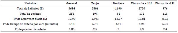 El promedio del tiempo de ordeño por vaca de Tenjo es de 5,61 minutos (min) con 2,5 puestos de ordeño promedio, mientras que en Simijaca es de 4,17 min con 2 puestos de ordeño promedio. Los litros promedio por vacas diario de 12,91 L en Tenjo y de 13,07 L en Simijaca (Tabla 3.).