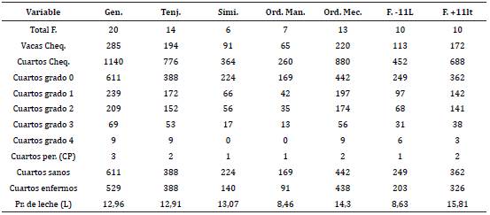 Se realizó estadística descriptiva de los datos obtenidos en la encuesta, para determinar frecuencia de las diferentes variables como lo son factores demográficos, fuentes de agua, asistencia técnica, infraestructura, producción de leche e inventario ganadero. Se determinó la prevalencia de la presentación de mastitis clínica y subclínica de acuerdo con la ubicación y al tipo de ordeño manual o mecánico.
