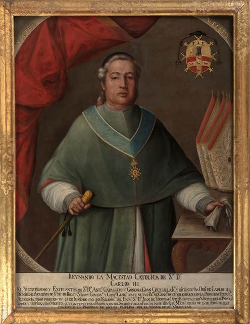 Pablo Antonio García del Campo (atribuido), Arzobispo Antonio Caballero y Góngora, virrey de 1782 a 1788, siglo XVIII. Óleo sobre tela, 126 x 94 cm, número de registro: 03.1.112. Colección Museo Colonial, Bogotá, Colombia.