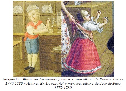 La segunda subserie la constituye la mezcla entre españoles y negros: aparece el tercer elemento básico de esta policromada paleta racial novohispana. El español no tenía prejuicios raciales en su vida sexual pero sí en la vida social, para la que usa el matrimonio. El cuarto cuadro corresponde a la mezcla de un español con una negra, generalmente ubicada en la cocina haciendo chocolate o pegándole con el molinillo al español (Imagen 13); o de una española con un negro, representación menos común, habitualmente vestido con atuendo de cochero, que producen al mulato(a) (Imagen 14). La mezcla del español con el negro, en condición de esclavitud, no tiene ninguna posibilidad de blanqueamiento, pues aun mezclándose los productos nuevamente con españoles blancos y disminuyendo por ello el porcentaje de sangre negra, esta parte de la serie en la Nueva España luego de producir morisco(a) y albino(a) siempre termina en Torna Atrás. Comparándolo con la primera parte de las mezclas, el morisco con tres abuelos españoles y uno negro- correspondería en porcentaje de sangre al castizo, que en la siguiente mezcla con español vuelve a ser blanco, sin embargo, morisco con español produce otra categoría racial nueva: el albino, que en contradicción con su nombre (representado colorísticamente como "más que blanco" y evidenciando su dificultad visual por falta de pigmento en el iris)24 (Imagen 15), y aun mezclándose nuevamente con un español o con una española produce siempre el Torna Atrás, el Salta Atrás: 4) De Español, y Ne-/gra, sale Mulato. 5) De Español, y/ Mulata, sale/ Morisca. 6) De Morisco, y/ Española, Albi-/no. 7) De Albino, y/ Española, lo que/ nace Torna atras.25 Humboldt, observó la condición problemática y degradante de las mezclas con el elemento negro en la Nueva España: