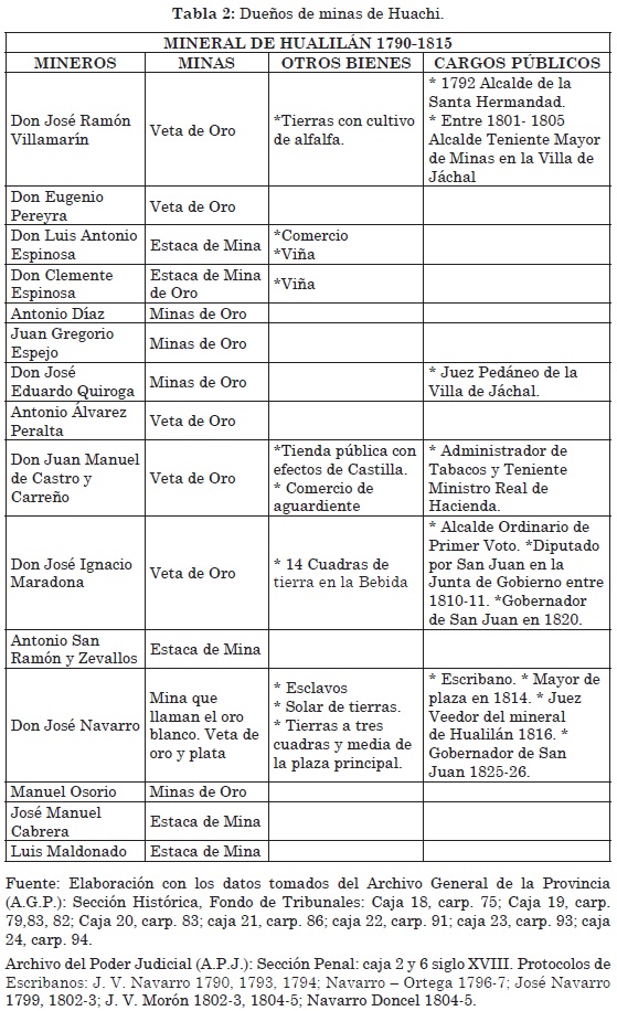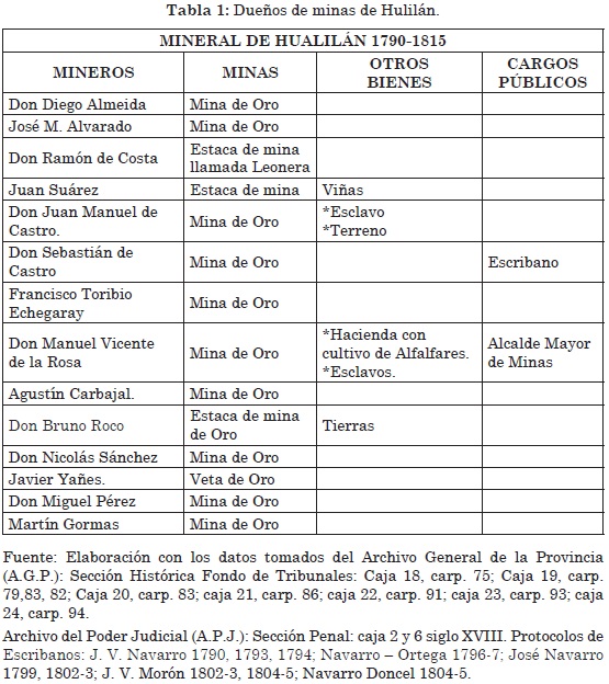 Es así que Don José Ramón Villamarín poseía una inca con alfalfares que servirían para el pastoreo de animales, propios o de arriendo, útiles para el laboreo de las minas. Otro tanto puede decirse de don José Navarro, heredero de buena fortuna y a quien su suegro -don Sebastián de Castro, también dueño de una mina en Hualilán- le transfirió el título de escribano público -como parte de la dote entregada a su hija al contraer enlace- asegurando para sí y su descendencia un favorable posicionamiento social, el cual más adelante le posibilitará desempeñarse como Gobernador de la Provincia.