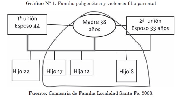 En el caso señalado en el gráfico 1, el joven de 17 años que agrede al padre de familia, convive con la madre y su segundo esposo y con los hermanos de esta segunda relación. Este joven manifiesta los recuerdos infantiles que tiene de su padre cuando afirma: