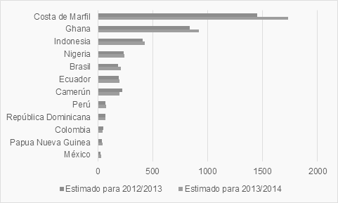 La producción de los dos mayores productores en el mundo, Costa de Marfil y Ghana, disminuyó en 85.000 toneladas; igualmente, se registran preocupantes descensos en Brasil y República Dominicana. En términos de participación en la producción, África continúa siendo la mayor región productora de cacao con más del 71%, seguida por América con el 16% y Asia-Oceanía con el 13% (ICO, 2013). Este déficit se debe a la baja oferta por la reducción en la producción en África Occidental, por su falta de productividad, plantaciones viejas, enfermedades y variaciones climáticas; a pesar de lo anterior, la demanda de cacao y derivados ha venido en aumento, siendo impulsada en buena parte por mercados emergentes, como: China, India y Brasil.