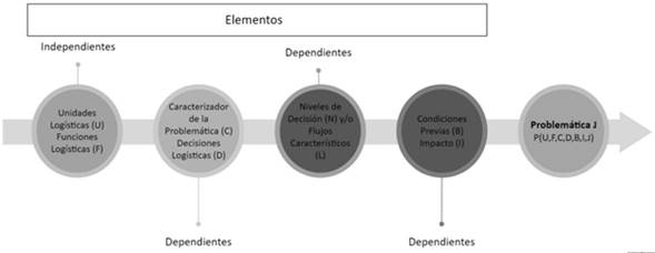 La metodología de la investigación se soporta en el trabajo de García-Cáceres & Escobar (2016), quienes desarrollaron una estructura de problemáticas de decisión de la CA, que establece un marco de decisión que identifica 123 problemáticas. El mencionado trabajo va en la línea teórica de Riopel et al. (2005), quienes identifican una estructura en red de las decisiones presentes en la CA, con 48 decisiones asociadas. P, es la nomenclatura con la que se identifica y clasifica una problemática dentro de la CA, la cual sintetiza intrínsecamente la caracterización de sus elementos o componentes y sus interacciones. Al respecto, la notación asociada a cada P es: Pi(U,F,C,D,B,I,J), donde el superíndice i es la etiqueta ó número de la problemática, (U) es la unidad logística, (F) es la función logística, (C) es el caracterizador de la problemática, (N) es el nivel de decisión, (L) es flujo característico, (D) es la decisión, (B) son las condiciones previas, (I) es el impacto y (J) son las alternativas, criterios, parámetros y supuestos que describen las P. Una P podría ser genérica con elementos vacíos, cuando está notada mínimo con los cuatro primeros campos (U,F,C,D); específica cuando tiene todos los componentes, o compleja cuando tiene campos múltiples-combinados, involucrando varias funciones logísticas. En la figura 1 se muestran los elementos de una problemática, donde se identifican los elementos independientes y dependientes.