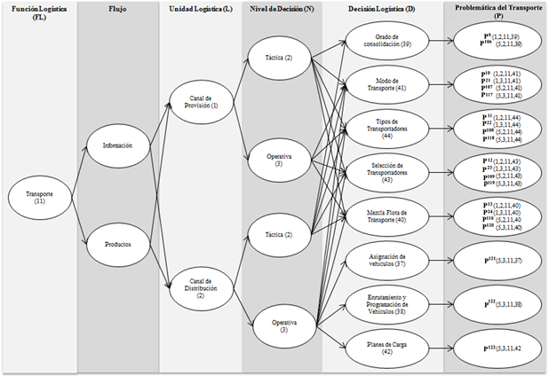 En la figura 2 se evidencia la relación entre la FLT con los flujos característicos de la CA, estos con los canales, los niveles de decisión y finalmente las decisiones y las problemáticas; por ejemplo, la decisión 39 se asocia a las problemáticas P9 y P106. De manera complementaria, se presenta con detalle la caracterización de la problemática de transporte, ver tabla 1, la cual guarda coherencia con la metodología presentada previamente.