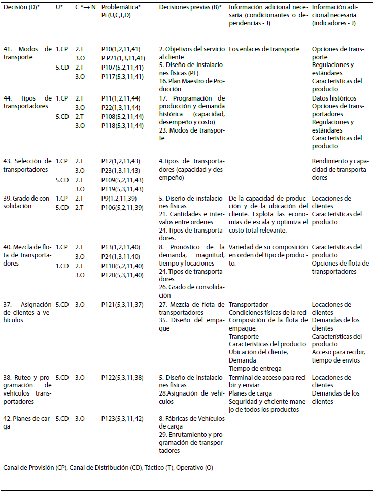 La tabla 1, además de presentar las problemáticas con sus cuatro elementos básicos (D, U, C, B), da respuesta como novedad a los elementos Decisiones previas (B), Impacto y precedencia (I), e Información adicional necesaria (condicionantes o dependencias - J) los cuales se presentan como perspectivas de investigación de los modelos de García-Cáceres y Escobar (2016), y Riopel et al. (2005). Específicamente, las decisiones de transporte son: Modos de Transporte, Tipos de Transportadores, Selección de Transportadores, Mezcla de Flota de Transporte, Grado de Consolidación, Asignación de Vehículos, Enrutamiento y Programación de Vehículos y Planes de Carga. En la problemática de transporte, los flujos de información y de productos se generan en los CP y CD; e interactúan en las decisiones a los diferentes Niveles (N).