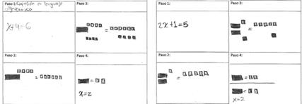 En la figura 10 se observan los procedimientos que utilizó el participante N° 35 para resolver dos ecuaciones: una ecuación de la forma: x+b=c y, la otra, de la forma: 𝑎𝑥+𝑏=𝑐. Se destaca el buen desempeño que presentó el participante durante los ejercicios propuestos. El participante logró asimilar el procedimiento sugerido en el manipulador virtual para resolver este tipo de ecuaciones, utilizando un modelo geométrico. Claramente, el participante cumple con el indicador: soluciona ecuaciones de primer grado utilizando modelos geométricos o algebraicos, perteneciente a la subcategoría Ecuaciones (E).