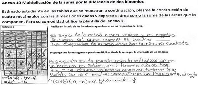 Multiplicación de la suma por la diferencia de binomios (a+b)(a-b). El desempeño de los participantes durante este encuentro fue destacable. La mayoría de ellos no tuvo inconvenientes al representar gráficamente las multiplicaciones de los binomios. Los estudiantes recordaron sin dificultad la propiedad uniforme de las igualdades y la aplicaron en la solución de los ejercicios propuestos. Algo para resaltar en este encuentro, fue la competencia que se generó alrededor de las construcciones. Un grupo numeroso de participantes compitió entre ellos para ver quien terminaba primero la actividad; en medio de esa competencia, el participante N° 38 comenta: “profe y eso que decían que el álgebra era difícil, le meten miedo desde sexto y mire, es fácil”. El participante N° 32 le replica: “es fácil porque estamos trabajando con las baldosas”. En la intervención de los participantes N° 38 y N° 32, se generó un entorno de sana competencia, lo que sugiere la presencia de la categoría Motivación (M). Los participantes realizaron las actividades con agrado.