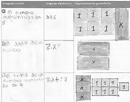 En la figura 8 se observan las representaciones que realizó el participante N° 5 en el paso de un sistema de representación semiótico a otro: pasó del lenguaje natural al lenguaje algebraico, realizando su representación geométrica. El estudiante interpreta que un número cualesquiera puede ser representado con una letra del alfabeto, utiliza la letra x para referirse a un número cualesquiera. De manera similar interpreta palabras claves que sugieren operaciones como: duplo, triple, doble, entre otras. En la producción del participante N° 5 se cumplió con el indicador: utiliza un modelo geométrico o algebraico para representar expresiones algebraicas de la subcategoría Expresiones algebraicas Equivalentes (EAE)