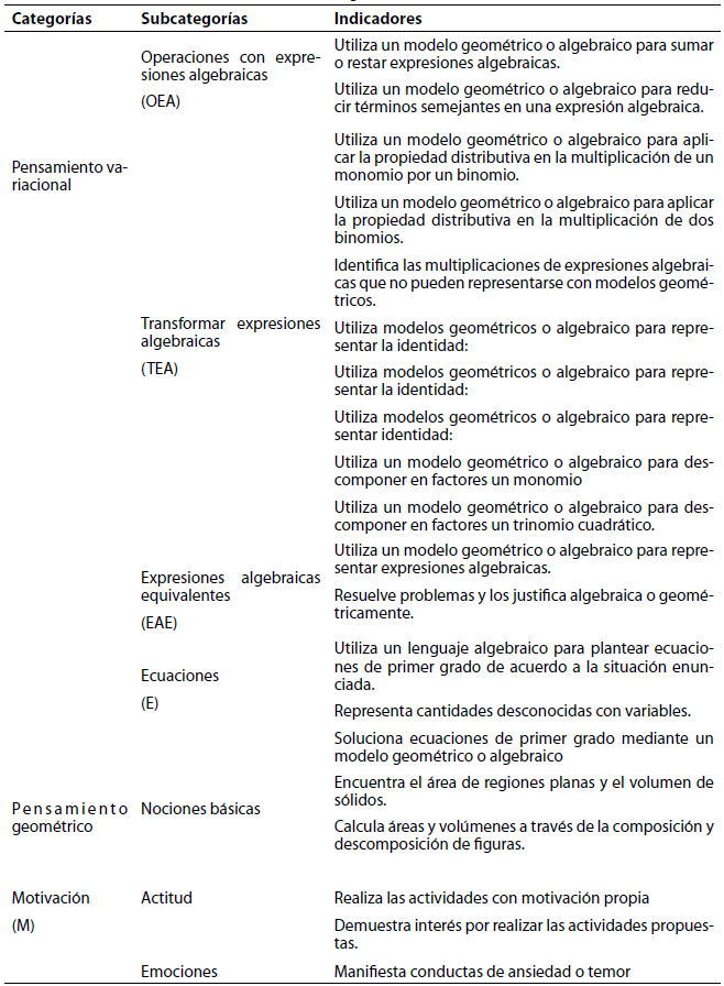 Para el diseño de las categorías de análisis se tuvieron en cuenta documentos como: Lineamientos Curriculares, Estándares Básicos de Competencia y Derechos Básicos de Aprendizaje del MEN. Con base en dichos documentos se plantearon unas categorías y subcategorías a priori, lo cual indica que es perfectamente plausible que emergieran otras que no se contemplaron, a la luz del análisis y la reflexión de las categorías iniciales en las producciones de los estudiantes. En la tabla 1 se presentan las categorías y subcategorías de análisis, mostrando los indicadores para evaluar las producciones de los estudiantes en las intervenciones pedagógicas.