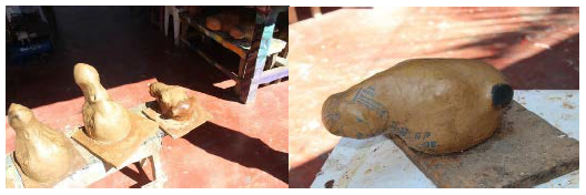 El artesano, con el uso de los dedos, moldea la arcilla, realizando un movimiento en el mismo sentido con los dos pulgares, para obtener la forma y posición donde van el ojo y el hocico. Con este movimiento, el ojo del lateral derecho y el ojo del lateral izquierdo de la máscara, quedan a igual distancia, según el artesano (ver Figura 2).