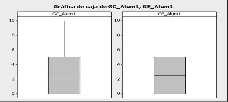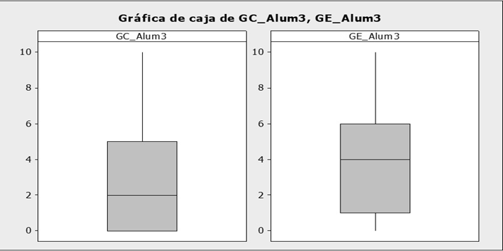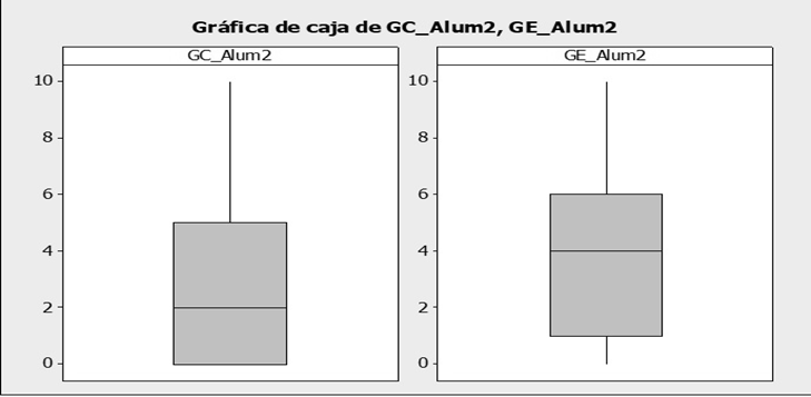 La preprueba se realizó al inicio del ciclo escolar, Agosto - Diciembre 2019, en la que se empleó un examen escrito diseñado con cinco problemas algebraicos (valor total de 10 puntos). Los resultados indican que el grupo experimental GE_Alum1 presentó una mayor calificación, con una media de 3.10, mientras que el grupo control GC_Alum1 obtuvo una media de 3.02, con un valor de p 0.844 que es mayor que el nivel de significancia de 0.05. Los datos anteriores revelan que no existe una diferencia significativa en las calificaciones de los 2 grupos. En la figura 3, se aprecia que el grupo experimental obtuvo un valor medio ligeramente mayor al del grupo control.