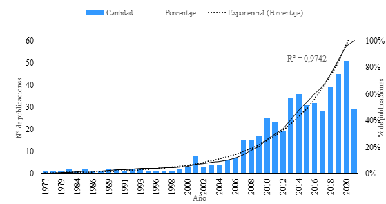 En este sentido, el crecimiento del volumen de publicaciones orientadas al estudio de estrategias de innovación en la administración pública se ve respaldado estadísticamente, pues en los últimos dos años se ha realizado aproximadamente el 25 % del total de publicaciones; en los últimos cuatro años, se ha presentado el 50 % del total de la producción científica; mientras que, en los últimos cinco años, se ha realizado el 75 % del total de publicaciones, revelando el crecimiento exponencial de las investigaciones (ver Figura 1).