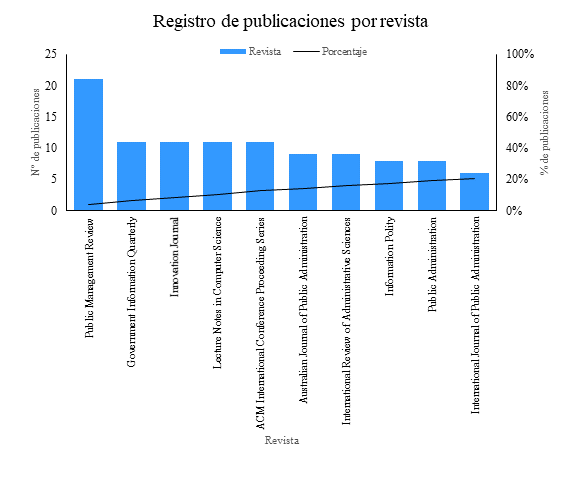 En cuanto a la productividad, la revista más productiva es la inglesa Public Management Review (21 artículos), la cual publica trabajos sobre gestión estratégica y operativa de los servicios públicos y la implementación de políticas sociales; su publicación más reciente: Is there a place for employee-driven pro-environmental innovations? The case of public organizations, aborda aspectos relacionados con el desarrollo de innovaciones medioambientales impulsadas al interior de las organizaciones y sus empleados (Yuriev et al., 2021).