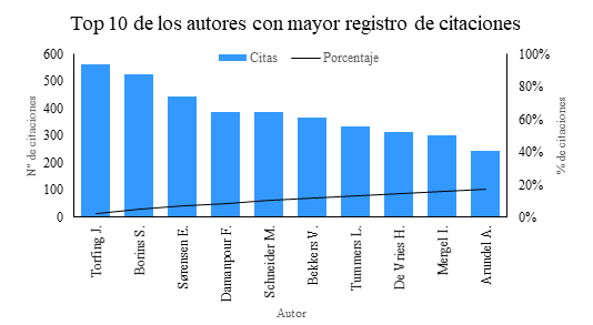Los resultados evidencian que el danés Jacob Torfing, con un total de 563 citaciones, es quien mayor impacto tiene en la comunidad académica; de las 563 citas, 318 provienen de su principal estudio Enhancing collaborative innovation in the public sector, realizado en coautoría con la danesa Eva Sørensen (tercera autora más citada), y que aborda la relación entre la innovación interdisciplinaria y la innovación en la administración pública (Sørensen & Torfing, 2011). En segundo lugar, se ubica el canadiense Sandford Borins, quien cuenta con 526 citaciones, y de quien conviene señalar que fue identificado previamente como el tercer autor más productivo; no obstante, su trabajo más representativo es Leadership and innovation in the public sector, donde se analiza la naturaleza y el papel del liderazgo en tres tipos ideales de innovación dentro de la gestión pública (Borins, 2002).