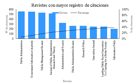 En primer lugar, se encuentra la revista inglesa Public Administration con 557 citaciones. Esta también se encuentra entre las revistas más productivas (Figura 2) y realiza publicaciones alrededor de temas que analizan los diferentes aspectos de la administración pública, las políticas y la gestión pública; su publicación más representativa: Innovation in the public sector: A systematic review and future research agenda, que posee 305 citas, recopila toda la literatura existente sobre la innovación en el sector público (De Vries et al., 2016).