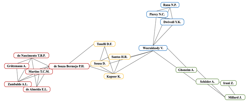 El segundo clúster -color amarillo- está compuesto por Santos H. R., Kapoor K., Tonelli D. F., Sousa D. y de Souza Bermejo P. H., colaboradores en la publicación del trabajo Collaborative innovation in the public sector a case of the brazilian federal Government; estos contribuyeron con la literatura científica, a partir del análisis estadístico de modelos que permitieran comprender, para contextos específicos, factores de co-creación e innovación en el sector público, a partir del análisis del ecosistema innovador del Gobierno Federal de Brasil (Santos et al., 2015).
