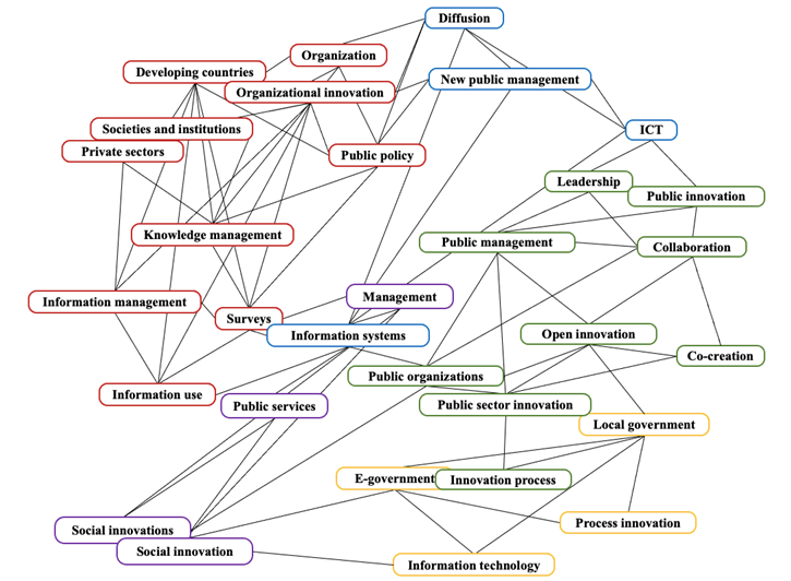 En la Figura 7 se expone el análisis de coocurrencia de palabras clave, mencionadas en los diferentes trabajos sobre estrategias de innovación en la administración pública. El principal clúster, representado con el color rojo, menciona la relación entre los términos Knowledge management, Information management, Information use, Surveys, Public Policy, Private sectors, Societies and Institutions, Organizational Innovation, Developing countries y Organization, que fueron usados de forma conjunta por Androutsopoulou et al. (2017) para describir la importancia de una plataforma, tanto integrada como inclusiva, para la innovación abierta en el sector público, comprendiendo factores de soporte de colaboración y recopilación y análisis de datos.