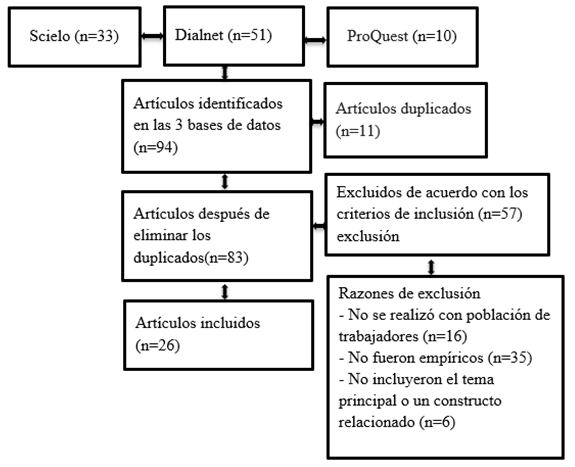 La unidad de análisis se integró por 94 artículos identificados en las bases de datos Psychology Database (ProQuest), SciELO y Dialnet; de estos, se descartaron 11 duplicados dando un total de 83 que se sometieron a una revisión profunda. En este proceso, 57 estudios fueron excluidos y 26 cumplieron los criterios de inclusión para la revisión a profundidad (Ver figura 1).