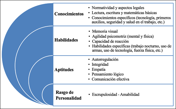 Al analizar las habilidades requeridas para el cargo, y a la luz de lo planteado por sus partes interesadas, es de resaltar que, en su mayoría, se obtuvieron respuestas muy homogéneas entre ellas. Incluso, en este aspecto hubo una coincidencia con lo planteado por la misma literatura existente sobre este mismo tema. Aquí se destacó la indicación de habilidades como memoria visual y agilidad mental como condiciones fundamentales para la labor de vigilancia y seguridad (en línea con lo reportado por Contreras-Pacheco, et al., 2022). Asimismo, fueron importantes la agilidad motriz, la capacidad de reacción, y algunas destrezas específicas del cargo, relacionadas principalmente con el uso de armas, tecnología y capacidad de trabajar en horarios nocturnos (respaldadas por estudios como los de Herrmann & Glaser, 2021; Lesmez-Peralta, et al., 2022; y Saikayasit, et al., 2013). En este punto es necesario aclarar que las especificidades de los diferentes roles que puede asumir el cargo de guardia de seguridad son múltiples y de la misma forma, las habilidades específicas demandadas para dicho rol. Es claro, por ejemplo, que hay una diferencia fundamental en componentes comunes para desempeñar una tarea de control de acceso a instalaciones, vigilancia física, servicio de escolta y/o monitoreo a través de circuitos cerrados de televisión. En consecuencia, más allá de la generalidad aquí expuesta, es una responsabilidad de cada empresa, el asegurarse (vía selección o entrenamiento) que el ocupante del cargo particular cuente con las habilidades necesarias para su correcto ejercicio.