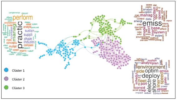 Reducing pollution in the shipping industry entails analyzing fuel consumption and its relationship with vessel speed. This research cluster identified factors influencing this issue, such as average speed for cargo transportation, scheduling to prevent engines running during extended waiting periods, and the supply of clean energy in ports. Additionally, aiming for decarbonization and generating economic and environmental benefits, measurement systems for CO2 emissions at sea were determined, along with the promotion of incentives for adopting cleaner fuels.