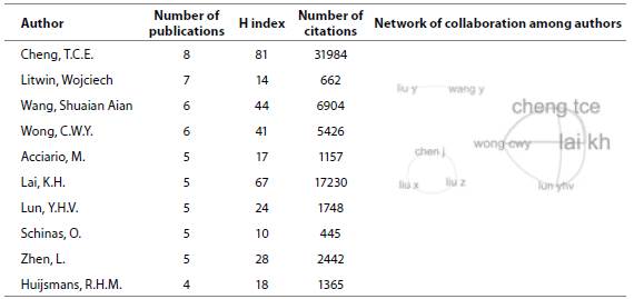 Table 3 exhibits the relevant indicators of key authors in the field of study. Foremost is T.C. Edwin Cheng from the Hong Kong Polytechnic University, leading with 8 publications and holding the position of the most cited author, accumulating a total of 31984 citations. Following in terms of indicators is K.H. Lai, positioned sixth, with a total of 17230 citations. Furthermore, other authors within the top 10 also feature in the table. Concerning author collaborations, the network emphasizes marked collaboration among T.C.E. Chen, C.W.Y. Wong, K.H. Lai, and Y.H.V. Lun, all included in the list of key authors.