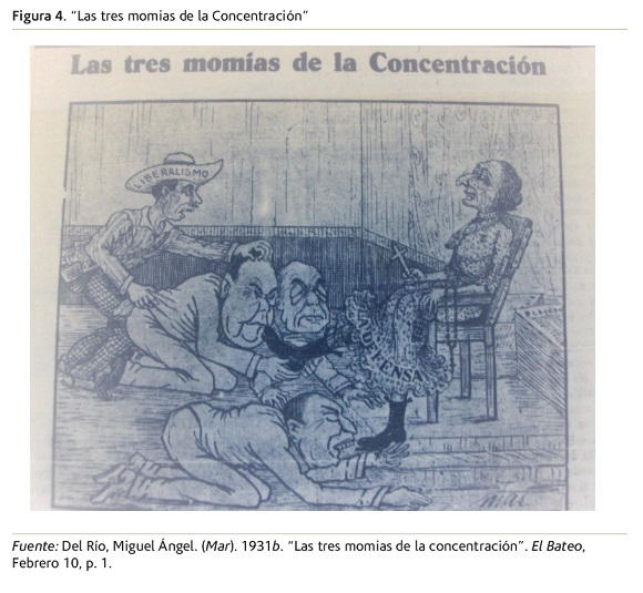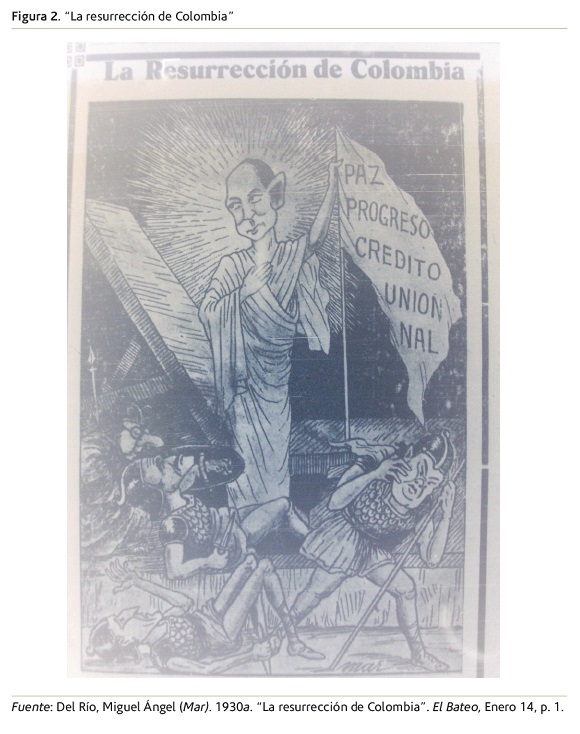 En las caricaturas "La entrada de Olaya Herrera a Cartagena" y "La resurrección de Colombia" la imagen del candidato estaba asociada a la de Jesús. En la primera, la escena asemejaba la entrada del nazareno a Jerusalén. Olaya cabalgaba sobre un asno saludando a la concurrencia que lo recibía agitando sus ramos. Entre sus discípulos estaba Carlos E. Restrepo quien tiraba del cabestro, mientras Clodomiro Ramírez y Alfonso López le hacían la guardia de honor.8 En "La resurrección de Colombia" Olaya salía de la tumba irradiando luz sobre su cabeza, la mano derecha en el pecho y en la izquierda una bandera que decía "paz, progreso, crédito y unión nacional". Los militantes conservadores Guillermo Valencia, Vásquez Cobo, Abadía y Carlos Vásquez Latorre, que hacían el papel de guardias romanos, estaban deslumbrados y temerosos por la aparición.9