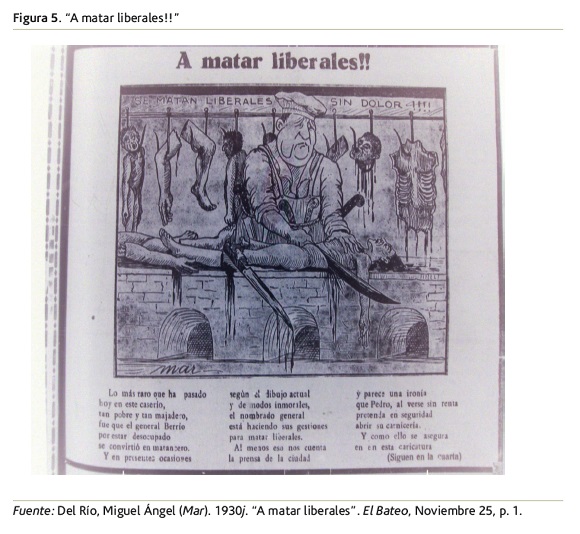 El Bateo estimulaba de este modo los odios sectarios entre ambos partidos. La caricatura "A matar liberales!!", cuya imagen produce más repugnancia que risa, presentaba a Pedro José Berrío (jefe del Partido Conservador en Antioquia y gobernador del departamento en varias ocasiones) como carnicero: la carne que vende es la de liberales descuartizados por su propia mano. "A matar liberales!!" es un buen ejemplo de cómo la caricatura puede contribuir a reforzar los odios políticos, acentuando el temor de los liberales y justificando la adopción de medidas violentas para "defenderse" del enemigo. Acevedo (1995, 2009) interpreta la caricatura editorial colombiana como un arma para la lucha política, resaltando que este género artístico no sólo funciona como un elemento humorístico desacralizador del poder, sino también como un medio de propaganda, que se encarga de defender a sus copartidarios de los ataques de los opositores y afianza los imaginarios y los odios políticos.